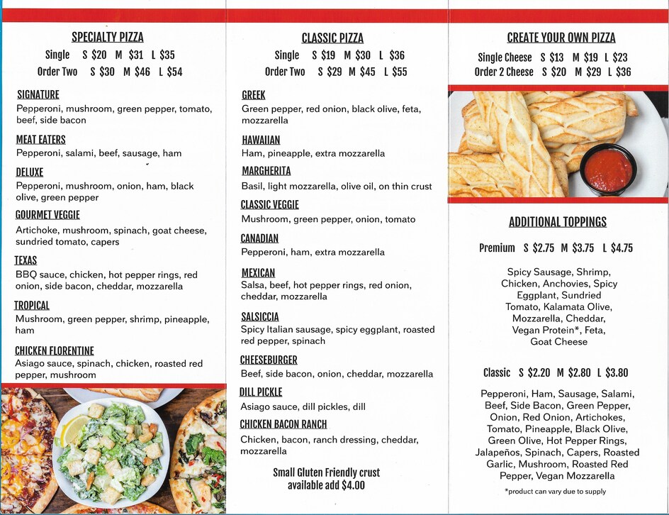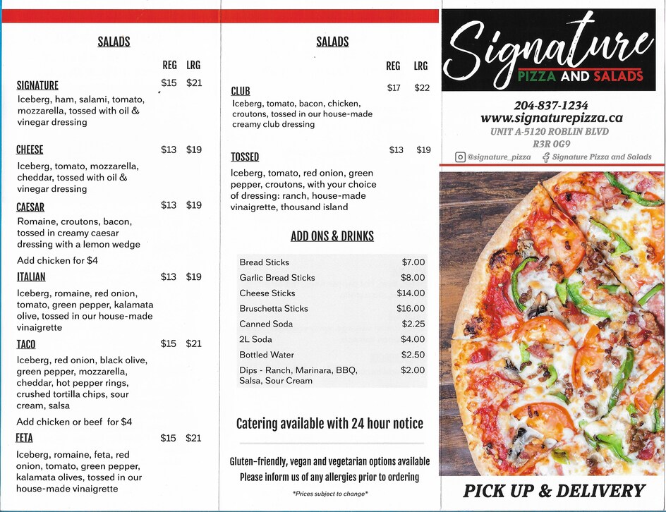 Signature Pizza and Salads Ltd. is a small local business owned by a longtime resident of Charleswood. We believe in only using fresh quality ingredients from local suppliers. Produce is prepared daily, along with our in-house sauce and dough.